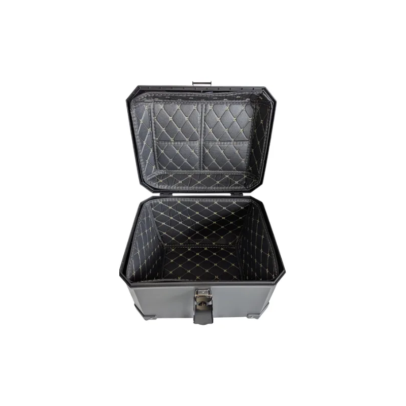 Su capacidad de 57 litros permite guardar dos cascos integrales, ropa o equipaje. Incluye base universal ajustable, compatible con la mayoría de parrillas traseras, ofreciendo una fijación segura y un acceso práctico a tus pertenencias.