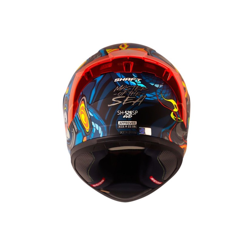 El CASCO INT SHAFT 526 EVO Master of the Sea está diseñado para motociclistas que buscan protección, confort y un diseño imponente inspirado en la fuerza del océano. Su gráfica en tonos azules refleja carácter y estilo, ideal para quienes quieren destacar en la vía sin perder seguridad.