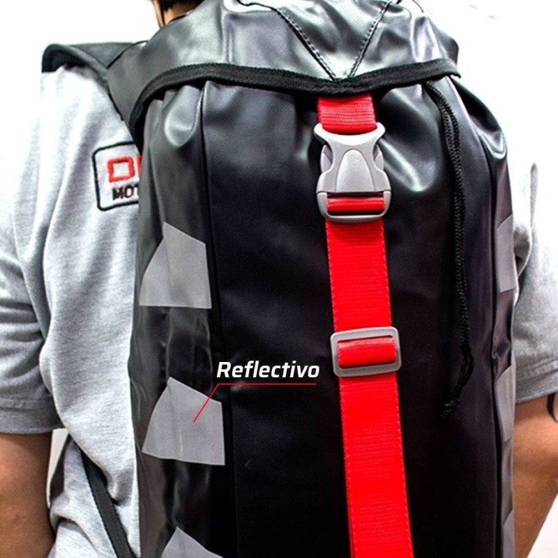 Morral Impermeable con detalles refletivo, correas ajustables.Medidas: 28cm ancho x 48cm largo x 22cm profundidad